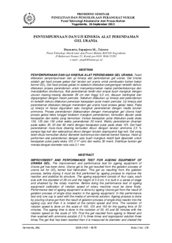 PENYEMPURNAAN DAN UJI KINERJA ALAT PERENDAMAN GEL URANIA. Telah dilakukan penyempurnaan dan uji kinerja alat perendaman gel urania. Gel Urania adalah gel hasil proses gelasi dari larutan sol urania untuk pembuatan bahan bakar kernel UO2. Gel hasil proses gelasi ini sebelum dilakukan pengeringan terlebih dahulu dilakukan proses perendaman untuk menyempurnakan reaksi pembentukannya dan menstabilkan strukturnya. Alat perendaman terdiri dari empat buah mangkuk dengan ukuran masing-masing diameter 29 cm dan tinggi 5,0 cm, disusun bertingkat dan digoyangkan dengan mesin pemutar. Sebelum dilakukan uji kinerja alat perendaman ini terlebih dahulu dilakukan peneraan kecepatan putar mesin pemutar. Uji kinerja alat perendaman dilakukan dengan merendam gel urania hasil proses gelasi tetes. Pada uji kinerja ini hanya digunakan satu mangkuk perendaman dengan media larutan ammonia. Proses perendaman dilaksanakan dengan menuangkan gel Urania hasil proses gelasi tetes tunggal kedalam mangkuk perendaman, kemudian diputar pada kecepatan dan waktu yang bervariasi. Variasi kecepatan putar dilakukan pada skala 100, 125 dan 150 untuk waktu perendaman 30 menit. Waktu perendaman divariasi pada waktu 30, 45 dan 60 menit dengan kecepatan putar pada skala 125. Gel hasil perendaman mula-mula disaring kemudian dicuci dengan larutan ammonia 2,5 % sampai tiga kali dan selanjutnya dicuci dengan larutan isopropanol tiga kali. Gel yang telah dicuci kemudian diukur diameter butirannya dan diamati bentuk fisisnya. Hasil uji performen alat perendaman dengan satu buah mangkuk relatif baik diperoleh untuk kecepatan putar pada skala 125 (117 rpm) dan waktu 30 menit. Distribusi butiran gel merata dengan diameter rata-rata 2,1 mm.