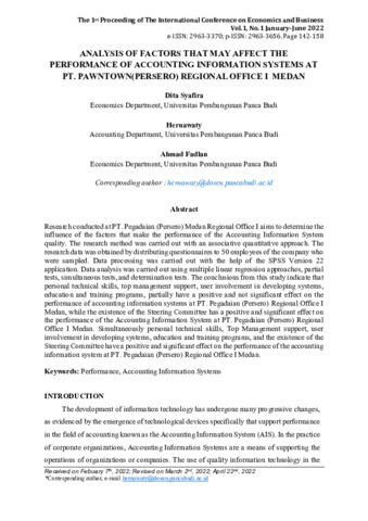 Dita, Syafira and Hernawaty, Hernawaty and Ahmad, Fadlan (2022) Analysis of factors that may affect the performance of accounting information systems at PT. Pawntown (Persero) Regional Office I Medan. In: The 1st Proceeding of The International Conference on Economics and Business.