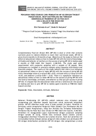 Etis, Fatmala Arum and Dede, Sri Mulyana (2024) Pengaruh video edukasi cara pembuatan MP ASI dengan tingkat pengetahuan, sikap dan perilaku ibu terhadap keberhasilan pemberian MP ASI pada bayi usia 6 bulan di PMB Indah Dwi Susanti A.Md.Keb. Manuju: Malahayati Nursing Journal, 6 (6): 10. pp. 2265-2274. ISSN 2655-2728