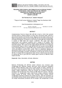 Makanan Pendamping ASI (MP-ASI) adalah makanan atau minuman yang mengandung gizi diberikan kepada bayi/anak untuk memenuhi kebutuhan gizinya. MP-ASI diberikan mulai umur 6 bulan sampai 24 bulan. Penelitia ini bertujuan untuk mengetahui Pengaruh Video Edukasi Cara Pembuatan Mp Asi Dengan Tingkat Pengetahuan, Sikap Dan Perilaku Ibu Terhadap Keberhasilan Pemberian Mp Asi Pada Bayi Usia 6 Bulan Di PMB Indah Dwi Susanti, A.Md.Keb. Penelitian ini menggunakan quasi esperimental dengan purposive sampling dengan sample 30 orang. Teknik data termasuk dalam analisis uivariat menggunakan distribusi frekuensi dan analisis bivariat. Hasil dari penelitian ini menunjukkan bahwa didapat adanya pengaruh video edukasi cara pembuatan MP ASI dengan keberhasilan pemberian MP ASI dengan nilai pengetahuan p-value 0,002 < 0,05, sikap dengan nilai p-value 0,001 < 0,05, dan perilaku p-value 0,001 < 0,05. Terdapat pengaruh yang signifikan video edukasi cara pembuatan MP ASI dengan keberhasilan pemberian MP ASI dengan tingkat pengetahuan, sikap, dan perilaku sehingga mendapatkan keberhasilan dalam pemberian MP ASI.