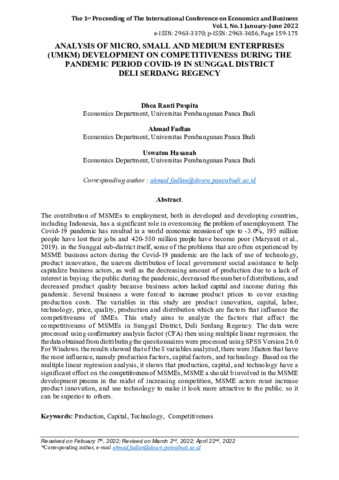 Dhea, Ranti Puspita and Ahmad, Fadlan and Uswatun, Hasanah (2022) Analysis of micro, small and medium enterprises (UMKM) development on competitiveness during the pandemic period Covid-19 in Sunggal District Deli Serdang REGENCY. In: The 1st Proceeding of The International Conference on Economics and Business.