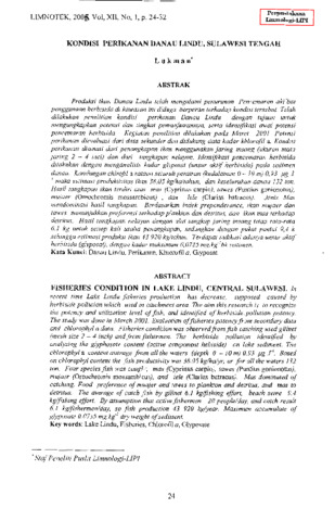 Produksi ikan Danau Lindu telah mengalami penurunan. Pencemaran akibatpenggunaan herbisida di kawasan ini diduga berperan terhadap kondisi tersebut. Telah dilakukan penelitian kondisi perikanan Danau Lindu dengan tujuan untukmengungkapkan potensi dan tingkat pemanfaatannya, serta identifikasi awal potensi pencemaran herbisida. Kegiatan penelitian dilakukan pada Maret 2001. otensi perikanan dievaluasi dari data sekunder dan didukung data kadar khlorofil a. Kondisi perikanan diamati dari penangkapan ikan menggunakan jaring insang (ukuran mata jaring 2 - 4 inci) dan dari tangkapan nelayan. Identifikasi pencemaran herbisida dilakukan dengan menganalisis kadar glyposat (unsur aktif herbisida) pada sedimen danau. Kandungan chirofil a rataan seluruh perairan (kedalaman 0-10m) 0,93 µg I¹ maka estimasi produktivitas ikan 38,05 kg/ha/tahun, dan keseluruhan danau 132 ton.Hasil tangkapan ikan terdiri atas mas (Cyprinus carpio), fawes (Puntius gonionotus), mujaer (Oreochromis mossambicus)lele (Clarias batracus).Jenis Mas, danmendominasi hasil tangkapan. Berdasarkan indek preponderance, ikan mujaer dan tawes menunjukkan preferensi terhadap plankton dan detritus, dan ikan mas terhadap detritus. Hasil tangkapan nelayan dengan alat tangkap jaring insang tetap rata-rata 6,1 kg untuk setiap kali usaha penangkapan, sedangkan dengan pukat pantai 9,4 k sehingga estimasi produksi ikan 43 920 kg/tahun. Terdapat indikasi adanya unsur aktif herbisida (glyposat), dengan kadar maksimum 0,0735 mg. kg¹ bk sedimen.