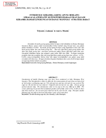 | Uncontrolled Keywords: | Keramba jaring apung berlapis, Danau Maninjau, Ramah lingkungan,Floating cages, Fish culture |