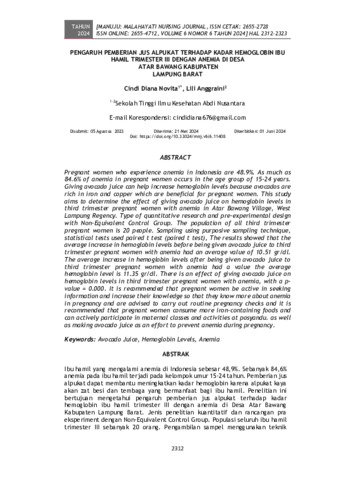 Cindi, Diana Novita and Lili, Anggraini (2024) Pengaruh pemberian jus alpukat terhadap kadar hemoglobin ibu hamil trimester III dengan anemia di Desa Atar Bawang Kabupaten Lampung Barat. Manuju: Malahayati Nursing Journal, 6 (6): 15. pp. 2312-2323. ISSN 2655-2728