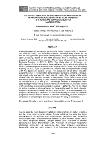 Cenayang, Dara Yasa and Lili, Anggraini (2024) Efektivitas pemberian jus strawberry dan madu terhadap peningkatan hemoglobin pada ibu hamil trimester III di Puskesmas Ketapang Kabupaten Lampung Utara. Manuju: Malahayati Nursing Journal, 6 (6): 17. pp. 2338-2350. ISSN 2655-2728