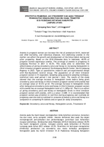 Anemia pada ibu hamil dapat meningkatkan risiko kelahiran prematur, kematian ibu dan anak, serta penyakit infeksi. Anemia defisiensi besi pada ibu dapat mempengaruhi pertumbuhan dan perkembangan janin/bayi saat kehamilan maupun setelahnya. Berdasarkan data Riskesdas 2018 di Indonesia sebesar 48,9% ibu hamil mengalami anemia. Cakupan anemia pada kehamilan di Provinsi Lampung pada tahun 2021 sebesar 43,5%. Penelitian ini bertujuan mengetahui efektivitas pemberian jus strawberry dan madu terhadap peningkatan hemoglobin pada ibu hamil trimester III di Puskesmas Ketapang Kabupaten Lampung Utara Tahun 2023. Jenis penelitian kuantitatif dan rancangan pra eksperiment dengan Non-Equivalent Control Group. Populasi seluruh ibu hamil trimester III sebanyak 15 orang. Pengambilan sampel menggunakan teknik purposive sampling, uji statistik yang digunakan uji t berpasangan (paired t test). Hasil penelitian rata–rata peningkatan kadar hemoglobin sebelum diberikan jus strawberry dan madu pada ibu hamil trimester III dengan anemia mempunyai nilai rata-rata 10,513 gr/dl. Rata–rata peningkatan kadar hemoglobin sesudah diberikan jus strawberry dan madu pada ibu hamil trimester III dengan anemia mempunyai nilai rata-rata kadar hemoglobin 11,287gr/dl. Ada pengaruh pemberian jus strawberry dan madu terhadap kadar hemoglobin pada ibu hamil trimester III dengan anemia, dengan p-value = 0,000. Disarankan ibu hamil agar memperhatikan gizi selama kehamilan serta rutin melakukan pemeriksaan kehamilan dan disarankan untuk mengkonsumsi jus strawberry dan madu sebagai pendamping dalam mengkonsumsi tablet Fe dan baik untuk dikonsumsi setiap hari.
