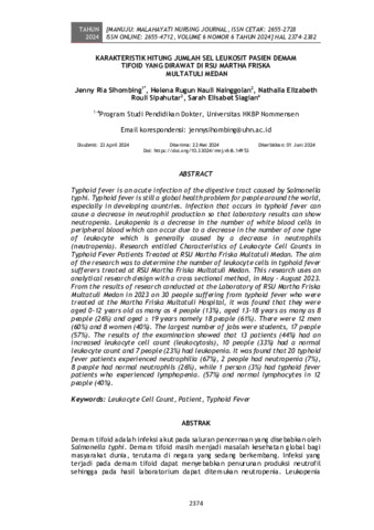 Jenny, Ria Sihombing and Helena, Rugun Nauli Nainggolan and Nathalia, Elizabeth Rouli Sipahutar and Sarah, Elisabet Siagian (2024) Karakteristik hitung jumlah sel leukosit pasien demam tifoid yang dirawat di RSU Martha Friska Multatuli Medan. Manuju: Malahayati Nursing Journal, 6 (6): 21. pp. 2374-2382. ISSN 2655-2728