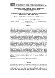 Demam tifoid adalah infeksi akut pada saluran pencernaan yang disebabkan oleh Salmonella typhi. Demam tifoid masih menjadi masalah kesehatan global bagi masyarakat dunia, terutama di negara yang sedang berkembang. Infeksi yang terjadi pada demam tifoid dapat menyebabkan penurunan produksi neutrofil sehingga pada hasil laboratorium dapat ditemukan neutropenia. Leukopenia merupakan penurunan jumlah sel darah putih dalam darah perifer yang dapat terjadi karena berkurangnya jumlah salah satu jenis leukosit yang umumnya disebabkan oleh penurunan neutrofil (neutropenia). Penelitian dengan judul Karakteristik Hitung Jumlah Sel Leukosit Pasien Demam Tifoid yang dirawat di RSU Martha Friska Multatuli Medan. Tujuan penelitian utukmenentukan jumlah sel leukosit pada penderita demam tifoid yang dirawat di RSU Martha Friska Multatuli Medan. Penelitian ini menggunakan disain penelitian analitik dengan metoda cross sectional, pada bulan Mei – Agustus 2023. Dari hasil penelitian yang dilakukan di Laboraturium RSU Martha Friska Multatuli Medan Tahun 2023 pada 30 orang penderita Demam tifoid yang dirawat di RS Martha Friska Multatuli didapatkan usia 0-12 tahun sebanyak 4 orang (13%), usia 13-18 tahun sebanyak 8 orang (26%) dan usia ≥ 19 tahun yaitu 18 orang (61 %). Jenis kelamin laki-laki sebanyak 12 orang (60%) dan perempuan sebanyak 8 orang (40%). Pekerjaan terbanyak adalah pelajar sebanyak 17 orang (57%). Didapatkan hasil pemeriksaan pasien dengan jumlah sel lekositnya meningkat (leukositosis) sebanyak 13 orang (44%), jumlah leukosit normal sebanyak 10 orang (33%), dan leukopenia sebanyak 7 orang (23%). Didapatkan pasien demam tifoid yang mengalami netrofilia sebanyak 20 orang (67%), neutropenia 2 orang (7%), netrofil normal 8 orang (26%), sedangkan pasien demam tifoid yang mengalami limfositosis sebanyak 1 orang (3%), limfopenia 17 orang (57%) dan limfosit normal 12 orang (40%).