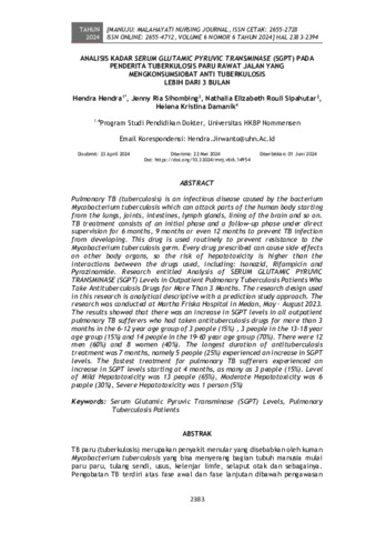 Hendra, Hendra and Jenny, Ria Sihombing and Nathalia, Elizabeth Rouli Sipahutar and Helena, Kristina Damanik (2024) Analisis kadar Serum Glutamic Pyruvic Transminase (SGPT) pada penderita tuberkulosis paru rawat jalan yang mengkonsumsi obat anti tuberkulosis lebih dari 3 bulan. Manuju: Malahayati Nursing Journal, 6 (6): 22. pp. 2383-2394. ISSN 2655-2728