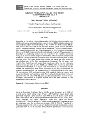 Netri, Makassar and Elfira, Sri Futriani (2024) Hubungan pre eklampsia pada ibu hamil dengan kejadian BBLR di RSUD kelas D Pondokgede. Manuju: Malahayati Nursing Journal, 6 (6): 23. pp. 2395-2405. ISSN 2655-2728