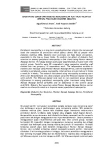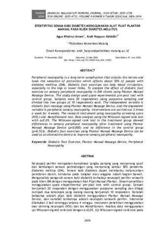 Agus, Khoirul Anam and Andi, Hayyun Abiddin (2024) Efektifitas senam kaki diabetes menggunakan alat pijat plantar manual pada klien diabetes mellitus. Manuju: Malahayati Nursing Journal, 6 (6): 24. pp. 2406-2414. ISSN 2655-2728