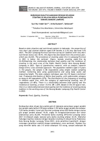 Suci, Nur Indah Sari and Anita, Bustami and Setiawati, Setiawati (2024) Hubungan kualitas makanan dengan kejadian stunting di Wilayah Kerja Puskesmas Kota Karang Bandar Lampung. Manuju: Malahayati Nursing Journal, 6 (6): 32. pp. 2491-2500. ISSN 2655-2728