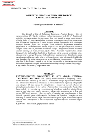 Fachmijany, Sulawesty and Sumarni, Sumarni (2004) Komunitas fitoplankton di Situ Pondok, Kabupaten Tangerang. Limnotek : Perairan Darat Tropis di Indonesia, 11 (2): 5. pp. 36-44. ISSN 2549-8029