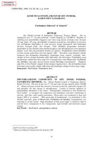 Situ Pondok terletak di Kabupaten Tangerang, Propinsi Banten. Situ ini mempunyai luas 27,7 ha dan perkiraan volume tampung air 540.000 mᶾ. Kegiatan di sekeliling situ menyebabkan tingginya unsur hara yang masuk, terutama unsur nitrogen (N) dan fosfor (P) yang menimbulkan terjadinya penyuburan (eutrofikasi) di perairan situ. Kelimpahan fitoplankton di suatu perairan sangat dipengaruhi oleh kandungan haranya terutama fosfor dan nitrogen. Telah dilakukan pengamatan komunitas fitoplankton di Situ Pondok untuk melihat komposisi dan kelimpahannya serta kaitannya dengan unsur hara dan parameter kualitas air lainnya. Pengambilan contoh dilakukan di enam stasiun pada bulan Juni dan Agustus 2002. Parameter yang dianalisis adalah komposisi dan kelimpahan fitoplankton, kandungan nitrat, amonia, ortofosfat, suhu, oksigen terlarut, derajat keasaman (pH), kekeruhan, dan kecerahan. Fitoplankton yang mendominasi adalah dari kelas alga biru (Cyanophyceae) yaitu Microcystis, Oscillatoria dan Spirulina, dan pada stasiun tertentu terjadi blooming Cyanophyceae. Tingginya alga biru di Situ Pondok tampak terkait dengan tingginya hara, dan berimplikasi pada kecerahan yang rendah, tingkat kekeruhan dan kandungan oksigen terlarut yang tinggi
