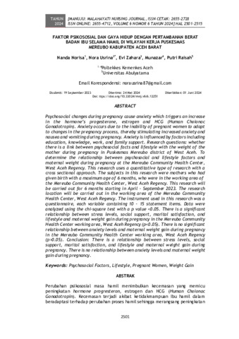 Nanda, Norisa and Nora, Usrina and Evi, Zahara and Munazar, Munazar and Putri, Raisah (2024) Faktor psikososial dan gaya hidup dengan pertambahan berat badan ibu selama hamil di Wilayah Kerja Puskesmas Mereubo Kabupaten Aceh Barat. Manuju: Malahayati Nursing Journal, 6 (6): 33. pp. 2501-2515. ISSN 2655-2728