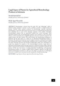 Biotechnology is derived from the words "bio" and "technology", which isdefined as living organisms or systems to solve a problem or produce a valuable product for humans. Humans utilize products produced by biotechnology, especially agriculturalbiotechnology, to meet their daily needs and survival. The use of biotechnology inventions has been widespread due to some of the advantages obtained in this product. Undeniably,biotechnological products that are genetically modified have several advantages. Some agricultural products that are biotechnological products can be resistant to pests and various diseases, use fewer pesticides, have a delightful appearance, have more nutrients compared to the original product, and other benefits. This article discusses the biotechnology development in Indonesia and the legal aspects of a patent for an Agricultural Biotechnology Product in Indonesia. The advancements that have existed in physics, chemistry, mathematics and biology have stimulated the progress of biotechnology. In addition, there is a greater demand to achieve the targets with faster processes and innovative breakthroughs, which can be advantageous for people also stimulate the inception of the biotechnological invention. Legal aspects of agricultural biotechnology products get legal protection in intellectual property rights, especially patents. Legal protection of patents on biotechnological products in agriculture is granted to the process, in this case, the process of making agricultural biotechnology and agricultural biotechnology products, for example, drought-tolerant transgenic sugarcane and high yield.Health biotechnological inventions, in this case, the design is in the form of technological discoveries or medical tools or processes from the manufacture of health biotechnology.