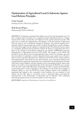 Vicko, Taniady and Robi, Kurnia Wijaya (2023) Optimization of agricultural land in Indonesia against land reform principles. In: Proceeding The 1st International Conference on Law and Society, 20 November 2021, Aula Konferensi, Fakultas Hukum, Universitas Jember.