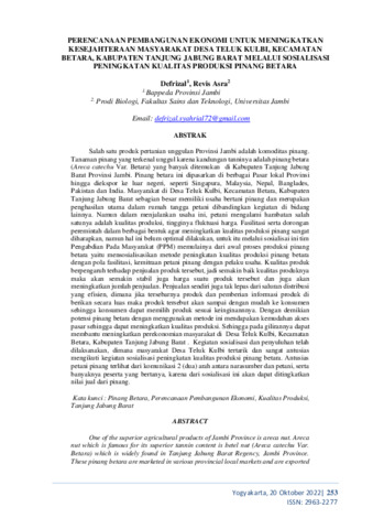 Defrizal, Defrizal and Revis, Asra (2022) Perencanaan pembangunan ekonomi untuk meningkatkan kesejahteraan masyarakat Desa Teluk Kulbi, Kecamatan Betara, Kabupaten Tanjung Jabung Barat melalui sosialisasi peningkatan kualitas produksi pinang betara. In: Prosiding Seminar Nasional Hasil Penelitian dan Pengabdian Masyarakat “Teknologi Pengolahan Dan Pengembangan Material Maju, 20 Oktober 2022, Yogyakarta.