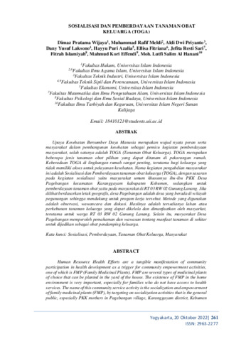 Dimaz, Pratama Wijaya and Muhammad, Rafif Meldi and Aldi, Dwi Priyanto and Dany, Yusuf Laksono and Hayyu, Puri Azalia and Ellisa, Fitriana and Jefita, Resti Sari and Fitrah, Islamiyah and Mahmud, Kori Effendi and Moh., Lutfi Salim Al Hanani (2022) Sosialisasi dan pemberdayaan tanaman obat keluarga (TOGA). In: Prosiding Seminar Nasional Hasil Penelitian dan Pengabdian Masyarakat “Teknologi Pengolahan Dan Pengembangan Material Maju, 20 Oktober 2022, Yogyakarta.