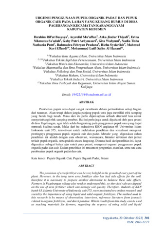 Ibrahim, Rif'at Basysya and Asyroful, Mu'affan and Azka, Jindar Thiyafi and Erina, Nikmatus Sa'adah and Gaby, Putri Ardynasari and Gita, Wahyuni and Nadia, Tisha Nathania Putri and Rahmadea, Febryan Pradana and Rizha, Syukrilah and Mahmud, Kori Effendi and Mohammad, Lutfi Salim Al Hanani (2022) Urgensi penggunaan pupuk organik padat dan pupuk organik cair pada lahan yang kurang humus di Desa Pagebangan Kecamatan Karanggayam Kabupaten Kebumen. In: Prosiding Seminar Nasional Hasil Penelitian dan Pengabdian Masyarakat “Teknologi Pengolahan Dan Pengembangan Material Maju, 20 Oktober 2022, Yogyakarta.