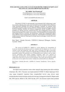 Penyebaran COVID-19 sulit terkendali yang berdampak pada kelangsungan usahadan memaksa seluruh pelaku usaha untuk bertransformasi ke era digital. Hal itu dilakukan untuk memenuhi kebutuhan dan kepuasan pelanggan. Penelitian ini bertujuan untuk mengetahui pengaruh kualitas layanan elektronik terhadap kepuasan pelanggan Amanda Brownies Bandung. Penelitian ini didesain menggunakan metode kuantitatif. Populasi penelitian ini seluruh konsumen Amanda Brownies yang menggunakan layanan online dengan teknik pengambilan sampel secara random. Teknik pengambilan dan pengumpulan data meliputi observasi, kuesioner, dan dokumentasi. Analisis data menggunakan regresi linier sederhana untuk menguji hipotesis melalui uji t. Hasil penelitian menunjukkan bahwa kualitas layanan elektronik berpengaruh terhadap kepuasan pelanggan Amanda Brownies di Kota Bandung.