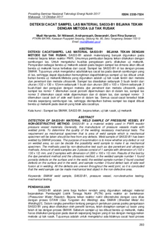 Mudi Haryanto, MH and Sri Nitiswati, SN and Andryansyah, AD and Deswandri, DW (2017) DETEKSI CACAT SAMPEL LAS MATERIAL SA533-B1 BEJANA TEKAN DENGAN METODA UJI TAK RUSAK. DETEKSI CACAT SAMPEL LAS MATERIAL SA533-B1 BEJANA TEKAN DENGAN METODA UJI TAK RUSAK. pp. 293-300. ISSN 2355-7524