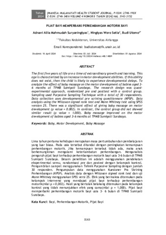 Adnani, Allia Mahmudah Suryaningtyas and Ningtyas, Woro Setia and Budi, Utomo (2024) Pijat bayi memperbaiki perkembangan motorik bayi. MAHESA: Malahayati Health Student Journal, 4 (8): 5. pp. 3143-3152. ISSN 2746-198X
