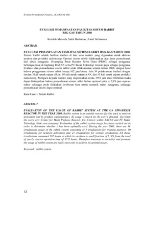 EVALUASI PEMANFAATAN FASILITAS SISTEM RABBIT RSG-GAS TAHUN 2008. Sistem Rabbit adalah fasilitas iradiasi di luar teras reaktor yang digunakan untuk aktivasi neutron dan produksi radioisotop. Operasi sistem rabbit dilaksanakan atas dasar permohonan dari pihak pengguna. Disamping Pusat Reaktor Serba Guna (PRSG) sebagai pengguna, beberapa pusat di lingkung BATAN serta PT Batan Teknologi tercatat juga sebagai pengguna. Evaluasi dan pemanfaatan sistem rabbit telah dilaksanakan selama tahun 2008, dengan hasil bahwa penggunaan sistem rabbit hanya 102 jam/tahun. Ada 34 pelaksanaan iradiasi dengan rincian 3 kali untuk tujuan diklat, 10 kali untuk tujuan AAN, dan 10 kali untuk tujuan produksi radioisotop. Mengacu kepada reaktor yang dioperasikan rerata 3552 jam atau 148/tahun maka dapat disimpulkan bahwa pemanfaatan sistem rabbit belum optimal yaitu 2,9% jam operasi raktor sehingga perlu dilakukan terobosan baru untuk menarik minat pengguna, sehingga pemanfaatan sistem dapat optimal.