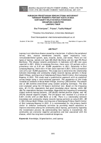 Eka, Trismiyana and Triyoso, Triyoso and Taufiq, Hidayat (2024) Hubungan pengetahuan dengan stigma masyarakat terhadap penderita penyakit kusta di Desa Karyamukti Wilayah Kerja Puskesmas Sekampung Kabupaten Lampung Timur. MAHESA: Malahayati Health Student Journal, 4 (8): 10. pp. 3201-3215. ISSN 2746-198X