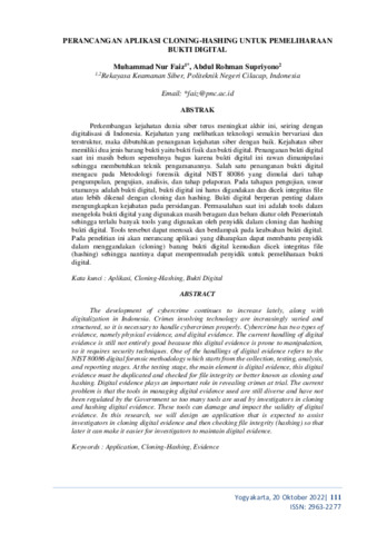 Muhammad, Nur Faiz and Abdul, Rohman Supriyono (2022) Perancangan aplikasi cloning-hashing untuk pemeliharaan bukti digital. In: Prosiding Seminar Nasional Hasil Penelitian dan Pengabdian Masyarakat “Teknologi Pengolahan Dan Pengembangan Material Maju, 20 Oktober 2022, Yogyakarta.