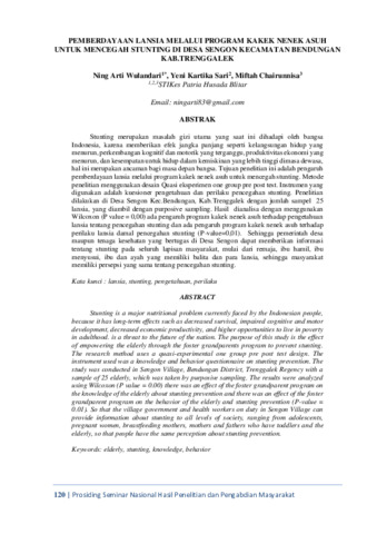 Ning, Arti Wulandari and Yeni, Kartika Sari (2022) Pemberdayaan lansia melalui program kakek nenek asuh untuk mencegah stunting di Desa Sengon Kecamatan Bendungan Kab.Trenggalek. In: Prosiding Seminar Nasional Hasil Penelitian dan Pengabdian Masyarakat “Teknologi Pengolahan Dan Pengembangan Material Maju, 20 Oktober 2022, Yogyakarta.