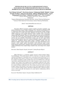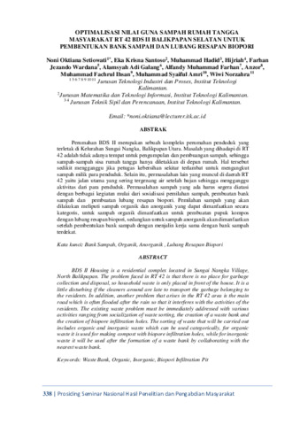 Noni, Oktiana Setiowati and Eka, Krisna Santoso and Muhammad, Hadid and Hijriah, Hijriah and Farhan, Jezando Wardana and Alamsyah, Adi Galang and Alfandy, Muhammad Farhan and Anzor, Anzor and Muhammad, Fachrul Ihsan and Muhammad, Syaiful Amri and Wiwi, Norzahra (2022) Optimalisasi nilai guna sampah rumah tangga masyarakat RT 42 BDS II Balikpapan Selatan untuk pembentukan bank sampah dan lubang resapan biopori. In: Prosiding Seminar Nasional Hasil Penelitian dan Pengabdian Masyarakat “Teknologi Pengolahan Dan Pengembangan Material Maju, 20 Oktober 2022, Yogyakarta.