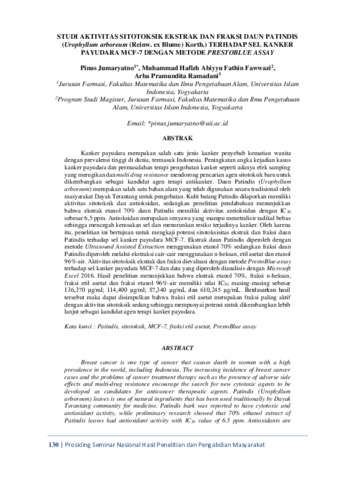 Pinus, Jumaryatno and Muhammad, Hafizh Abiyyu Fathin Fawwazi and Arba, Pramundita Ramadani (2022) Studi aktivitas sitotoksik ekstrak dan fraksi daun patindis (Urophyllum arboreum (Reinw. ex Blume) Korth.) terhadap sel kanker payudara MCF-7 dengan metode Prestoblue Assay. In: Prosiding Seminar Nasional Hasil Penelitian dan Pengabdian Masyarakat “Teknologi Pengolahan Dan Pengembangan Material Maju, 20 Oktober 2022, Yogyakarta.