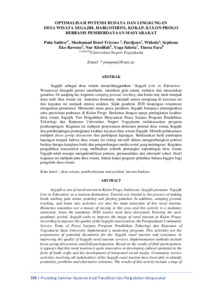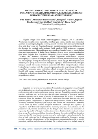 Putu, Sudira and Mochamad, Bruri Triyono and Pardjono, Pardjono and Widodo, Widodo and Septiono, Eko Bawono and Nur, Kholifah and Yoga, Sahria and Tinesa, Fara (2022) Optimalisasi potensi budaya dan lingkungan desa wisata Segajih, Hargotirto, Kokap, Kulon Progo berbasis pemberdayaan masyarakat. In: Prosiding Seminar Nasional Hasil Penelitian dan Pengabdian Masyarakat “Teknologi Pengolahan Dan Pengembangan Material Maju, 20 Oktober 2022, Yogyakarta.