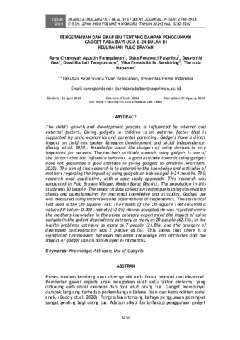 Reny, Chamsyah Agustin Panggabean and Siska, Perawati Pasaribu and Desvornia, Gea and Dewi, Hartati Tampubolon and Vika, Ermaluita Br.Sembiring and Tiarnida, Nababan (2024) Pengetahuan dan sikap ibu tentang dampak penggunaan gadget pada bayi usia 6-24 bulan di Kelurahan Pulo Brayan. MAHESA: Malahayati Health Student Journal, 4 (8): 13. pp. 3250-3262. ISSN 2746-198X