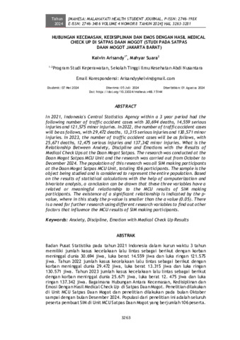 Kelvin, Arisandy and Mahyar, Suara (2024) Hubungan kecemasan, kedisiplinan dan emosi dengan hasil medical check up di Satpas Daan Mogot (Studi pada Satpas Daan Mogot Jakarta Barat). MAHESA: Malahayati Health Student Journal, 4 (8): 14. pp. 3263-3281. ISSN 2746-198X