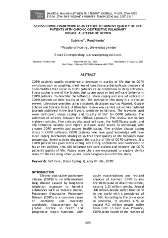 Sutrisno, Sutrisno and Rondhianto, Rondhianto (2024) Stress coping framework as an effort to improve quality of life patients with chronic obstructive pulmonary disease: A literature review. MAHESA: Malahayati Health Student Journal, 4 (8): 16. pp. 3297-3311. ISSN 2746-198X