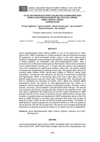 Firman, Sugiharto and Defa, Larashati and Wulan, Puspita Sari and Ayu, Prawesti and Ristina, Mirwanti and Aan, Nuraeni (2024) Acute decompensated heart failure pasca kardioversi pada pasien lansia dengan diabetes mellitus dan chronic kidney disease: Sebuah laporan kasus. MAHESA: Malahayati Health Student Journal, 4 (8): 18. pp. 3326-3340. ISSN 2746-198X