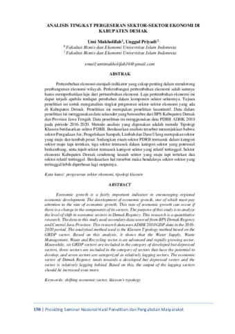 Umi, Mukholifah and Unggul, Priyadi (2022) Analisis tingkat pergeseran sektor-sektor ekonomi di Kabupaten Demak. In: Prosiding Seminar Nasional Hasil Penelitian dan Pengabdian Masyarakat “Teknologi Pengolahan Dan Pengembangan Material Maju, 20 Oktober 2022, Yogyakarta.