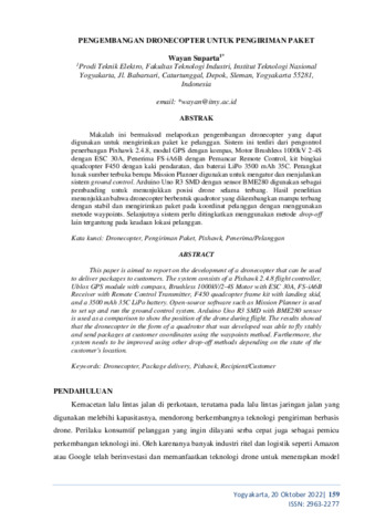 Makalah ini bermaksud melaporkan pengembangan dronecopter yang dapatdigunakan untuk mengirimkan paket ke pelanggan. Sistem ini terdiri dari pengontrol penerbangan Pixhawk 2.4.8, modul GPS dengan kompas, Motor Brushless 1000kV 2-4S dengan ESC 30A, Penerima FS-iA6B dengan Pemancar Remote Control, kit bingkai quadcopter F450 dengan kaki pendaratan, dan baterai LiPo 3500 mAh 35C. Perangkat lunak sumber terbuka berupa Mission Planner digunakan untuk mengatur dan menjalankan sistem ground control. Arduino Uno R3 SMD dengan sensor BME280 digunakan sebagai pembanding untuk menunjukkan posisi drone selama terbang. Hasil penelitian menunjukkan bahwa dronecopter berbentuk quadrotor yang dikembangkan mampu terbang dengan stabil dan mengirimkan paket pada koordinat pelanggan dengan menggunakan metode waypoints. Selanjutnya sistem perlu ditingkatkan menggunakan metode drop-off lain tergantung pada keadaan lokasi pelanggan.