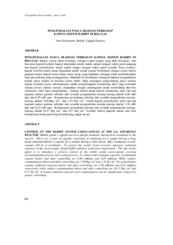 PENGENDALIAN PASCA IRADIASI TERHADAP KAPSUL SISTEM RABBIT DI RSG-GAS. Kapsul sistem rabbit berfungsi sebagai wadah sampel yang akan diiradiasi. Ada dua jenis kapsul meliputi kapsul aluminium untuk wadah sampel dengan waktu paroh panjang dan kapsul polyethylene untuk wadah sampel dengan waktu paroh pendek. Pasca iradiasi, kapsul tersebut masih dapat digunakan untuk wadah sampel berikutnya dengan syarat bahwa paparan radiasi kapsul harus dalam batas harga yang diijinkan sehingga tidak membahayakan bagi para pekerja yang menanganinya. Makalah ini membahas tentang perlakuan/ pengendalian kapsul pasca iradiasi di fasilitas sistem rabbit. Pada prinsipnya pengendalian pasca iradiasi kapsul meliputi proses dekontaminasi untuk menghilangkan kontaminan aktif yang terbentuk selama proses iradiasi sampel, dilanjutkan dengan pendinginan untuk meluruhkan aktivitas radiasinya. Dari hasil pengendalian. didapat bahwa untuk kapsul aluminium, nilai rata-rata paparan radiasi gamma sebelum dan sesudah pengendalian masing-masing adalah 8,06 mR/ jam dan 0,29 mR/ jam. Kontaminasi permukaan sebelum dan sesudah pengendalian masing-masing adalah 70,83Bq/ cm2 dan 1,35 Bq/ cm2. Untuk kapsul polyethylene nilai rata-rata paparan radiasi gamma sebelum dan sesudah pengendalian masing-masing adalah 2,26 mR/ jam dan 0,23 mR/ jam. Kontaminasi permukaan sebelum dan sesudah pengendalian masing-masing adalah 10,17 Bq/ cm2 dan 0,57 Bq/ cm2. Terbukti bahwa paparan radiasi dan nilai kontaminasi kedua jenis kapsul berkurang sangat berarti