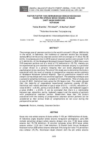 Yosica, Bramita and Titi, Astuti and Al, Murhan and Kodri, Kodri (2024) Faktor-faktor yang berhubungan dengan kecemasan pasien pre operasi seksio sesarea di Rumah Sakit Umum Handayani Kotabumi. MAHESA: Malahayati Health Student Journal, 4 (8): 21. pp. 3370-3383. ISSN 2746-198X