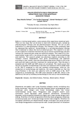 Desy, Natalia Siahaan and Eva, Sartika Dasopang and Salmah, Handayani Lubis and Latipah, Pahmi (2024) Analisis efektivitas biaya penggunaan aromaterapi pada nyeri menstruasi mahasiswi farmasi. MAHESA: Malahayati Health Student Journal, 4 (8): 25. pp. 3418-3433. ISSN 2746-198X