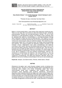 Dismenorea merupakan nyeri yang dirasakan sebagian wanita menjelang atau ketika menstruasi. Ada dua cara yang bisa dilakukan dalam menanggulangi nyeri menstruasi yaitu dengan cara terapi farmakologi (obat) dan terapi nonfarmakologi (tanpa obat). Penggunaan obat analgetik seperti asam mefenamat umum digunakan pada penderita dismenorea. Aromaterapi digunakan untuk mengatasi dismenorea tingkat nyeri ringan sampai dengan nyeri sedang. Penelitian ini untuk menganalisis efektivitas biaya penggunaan beberapa aromaterapi pada nyeri menstruasi dengan kontrol obat analgetik. Penelitian ini merupakan penelitian pre-eksperimental dengan rancangan two group pre-post test design menggunakan aromaterapi dan obat. Sampel penelitian ini mahasiswi farmasi sesuai kriteria inklusi. Responden dibagikan menjadi 4 kelompok. Kelompok 1, 2 dan 3 diberikan aromaterapi lavender, rose dan rosemary sedangkan kelompok ke 4 diberikan obat analgetik. Masing-masing kelompok terdiri dari 34 orang. Setiap responden diberikan lembar observasi untuk diisi skala nyeri yang dirasakan sebelum dan sesudah aromaterapi diberikan, demikian juga kelompok obat analgetik. Kemudian data dianalisis dan dihitung nilai ACER, ICERnya. Hasil membuktikan bahwa penggunaan aromaterapi lavender yang paling cost effective dengan nilai ACER Rp 562,77 dibandingkan aromaterapi rose dan rosemary, sedangkan untuk nilai ACER Rp 58,77 untuk obat dibandingkan aromaterapi. Nilai ICER pada aromaterapi rose Rp 200 yang berarti penambahan biaya pada aromaterapi rosemary sebesar Rp 200 untuk mendapatkan efektivitas seperti aromaterapi rose.