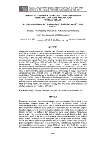 Nurhidayah, Muthohharoh and Dinda, Avrielya and Beti, Kristinawati and Susilo, Hartono (2024) Efektivitas terapi musik dan masase terhadap penurunan kesadaran serta klinis pasien dengan ventilasi mekanik. MAHESA: Malahayati Health Student Journal, 4 (8): 31. pp. 3477-3489. ISSN 2746-198X