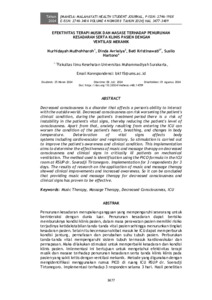Penurunan kesadaran merupakan gangguan yang mempengaruhi seseorang untuk berinteraksi dengan dunia luar. Penurunan kesadaran dapat berisiko memburuknya kondisi klinis pasien, dalam masa perawatan pasien memiliki risiko terjadinya ketidakstabilan tanda-tanda vital pasien sehingga menurunkan tingkat kesadaran pasien. Selain itu kecemasan akibat masuk ke ICU dapat memperburuk kondisi jantung, pernafasan dan perubahan suhu tubuh pasien. Perburukan tanda-tanda vital mempengaruhi sistem tubuh termasuk kardiovaskular dan pernapasan. Maka dilakukan stimulasi untuk memperbaiki kesadaran dan kondisi klinis pasien. Imlementasi ini bertujuan untuk mengetahui efektivitas terapi musik dan masase terhadap penurunan kesadaran serta tanda klinis klinis pada pasien yang sakit kritis dengan ventilasi mekanik. Metode yang digunakan dengan mengidentifikasi menggunakan rumus PICO di ruang ICU RSUP dr. Soeradji Tirtonegoro. Implementasi terhadap 3 responden selama 3 hari. Hasil penelitian penerapan terapi musik dan masase terdapat perbaikan klinis dan peningkatan kesadaran. Maka dapat disimpulkan pemberian terapi musik dan masase terhadap penurunan kesadaran serta tanda klinis terbukti efektif.
