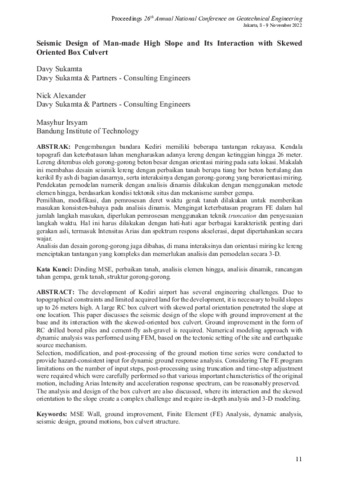 Davy, Sukamta and Nick, Alexande and Masyhur, Irsyam (2022) Seismic design of man-made high slope and its interaction with skewed oriented box culvert. In: Proceeding 26th Annual National Conference on Geotechnical Engineering, 8-9 November 2022, Jakarta.