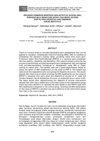 Neneng, Indrasari and Rahmatuz, Zulfia and Alfianur, Alfianur and Sulidah, Sulidah and Hasriana, Hasriana (2024) Pengaruh pemberian modifikasi Non-Nutritive Sucking (NNS) terhadap nilai Premature Infant Pain Profil–Revised (PIPP-R) pada neonatus yang diberikan vaksin hepatitis B. MAHESA: Malahayati Health Student Journal, 4 (8): 32. pp. 3490-3500. ISSN 2746-198X