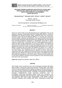 Ada berbagai macam manajemen nyeri non farmakologis yang dapat diterapkan pada neonatus, diantaranya adalah Non-Nutritive Sucking (NNS). NNS adalah metode untuk merangsang refleks mengisap neonatus, memberikan bantuan dari nyeri akut. Prematur Infant Pain Profile Revised (PIPP-R) merupakan pengkajian nyeri neonatus yang memiliki validitas, reliabilitas, dan kelayakan. Penelitian ini bertujuan menggambarkan proses penentuan manajemen nyeri non farmakologis yang dapat diterapkan dengan teknik atau manajemen non farmakologis menggunakan NNS atau hisap jari untuk mengurangi nyeri. Desain yang digunakan yaitu desain Quasi eksperimental untuk menilai pengaruh pemberian modifikasi NNS terhadap nilai PIPP-R. Pengambilan sampel pada responden yang diberikan vaksin Hepatits B. Data yang diperoleh yaitu ada pengaruh pemberian modifikasi NNS terhadap nilai PIPP-R pada neonatus yang diberikan vaksin Hepatitis B di Rumah Sakit H. Jusuf S.K Tarakan Provinsi Kalimantan Utara dibuktikan dengan nilai p <0.05. Nilai rata-rata setelah pemberian tindakan vaksin Hepatitis B menunjukkan terdapat perbedaan nilai rata-rata pada kelompok intervensi lebih efektif dalam menurunkan skala nyeri berdasarkan skala PIPP-R dengan modifikasi NNS dibandingkan kelompok kontrol. Pemberian modifikasi NNS terhadap nilai PIPP-R pada neonatus lebih efektif pada kelompok intervensi dibandingkan kelompok kontrol.