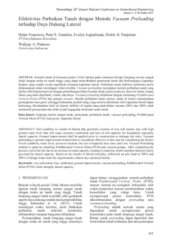 Helen, Fransisca and Putri, S. Gandina and Evelyn, Jogiadinata and Dolok, H. Panjaitan and Widjojo, A. Prakoso (2022) Efektivitas perbaikan tanah dengan metode vacuum preloading terhadap daya dukung lateral. In: Proceeding 26th Annual National Conference on Geotechnical Engineering, 8-9 November 2022, Jakarta.